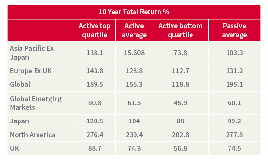 Bizarrely though, global fund investors might not be too miffed, even if they’ve got a fund that has underperformed the average passive machine. That’s because performance from this sector has been so strong, that absolute returns have been pretty spectacular, as the table below shows. Even bottom quartile global funds have doubled investors’ money over the last decade, and have returned more than top quartile funds in the UK, Global Emerging Markets and Asia Pacific ex-Japan sectors.