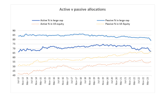 The global fund sector plays an outsized role in the poor overall showing from active managers, simply because of the sheer number of funds in this sector. If fund managers in this area were pulling their weight, rather than just 22% of them outperforming, the overall proportion of active managers beating a passive alternative would be nudging up to a more respectable 50%, which might be viewed as a neutral position. But in the global stock market, the last decade has been characterised by two long-running trends which have favoured a passive way of investing. Namely the dominance of US stocks, and large cap stocks. Global fund managers have been underweight these two winning areas compared to their passive peers as the chart below shows. Outperformance from these market segments has therefore boosted global passive funds at the expense of their active competitors, rather than it simply being a case that active managers are hopeless at picking good stocks for investment.