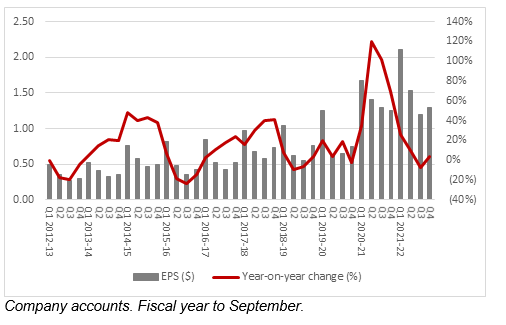 However, earnings momentum was still modest, as earnings per share grew by just 3% year-on-year.