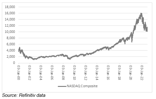 Equally, there is a danger that lofty valuations have simply caught up with them. Those who are tempted to argue that 2020-22 featured bubble, blown by cheap central bank liquidity, may hark back to the bursting of the last tech bubble in 2000. The NASDAQ peaked at 5,049 in March 2000 and then took 15 years to get back there, so extreme had valuations and high expectations become.