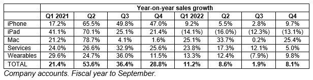 Apple did grow its sales and earnings yet again in the last reported quarter, the three months to the end of September. iPad sales stumbled once more, but wearables and accessories again performed strongly, and September’s launch of the iPhone 14 helped that revenue stream.