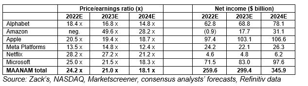 Even though Apple has been derated, through the process of that $1 trillion market cap loss, it still trades at a premium to the wider US market, as does the wider MAANAM grouping. Based on consensus earnings forecasts, the sextet trades on 21 times earnings for 2023 compared to 17 times for the S&P 500 benchmark index.