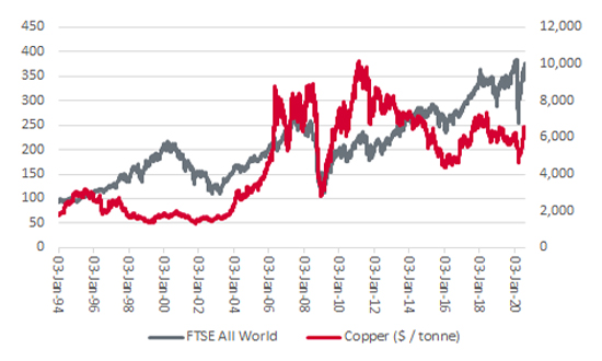 The metal is malleable, ductile and a terrific conductor. As such, it has many industrial uses – ranging from construction to automotive production to wiring to integrated circuits – and as a result, the metal is nicknamed ‘Doctor Copper’, because it is often seen as a good guide to the globe’s economic health. Advisers and clients also seem to treat copper as a useful indicator, since surges in copper seem to coincide with periods of strong performance from the FTSE All-World index and periods of weakness in both also seem to tally (although we must accept that the past is no guide at all to what may happen in the future).