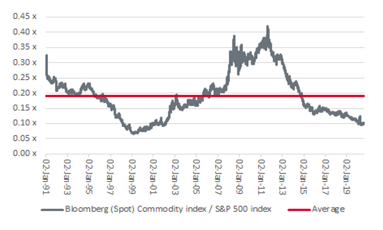 Commodity prices trade near their lows on relative basis against the S&P 500 index