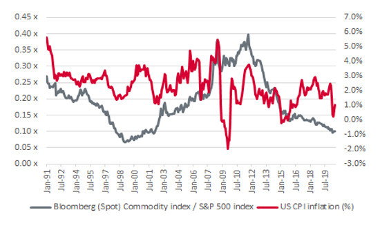 That narrative came unstuck fairly quickly. Oil – for one – has never reclaimed the heights it reached in 2007–08 and the Bloomberg Commodity index now trades close to the all-time relative lows against the rampant S&P 500 benchmark, reached when technology, media and telecoms (TMT) stocks were in very bubbly form in 1999.