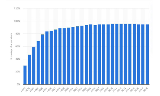 Percentage of households with central heating systems in the UK 1970–2018