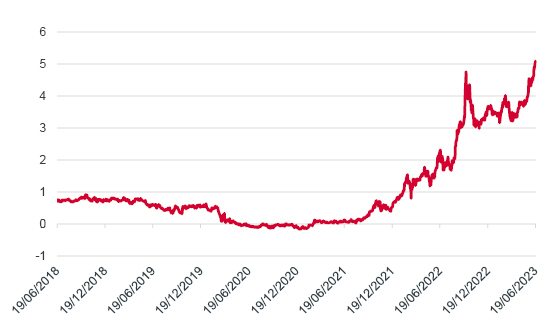 The cost of government borrowing over two years has topped 5% for the first time since 2008 as markets priced in further moves by the Bank of England.