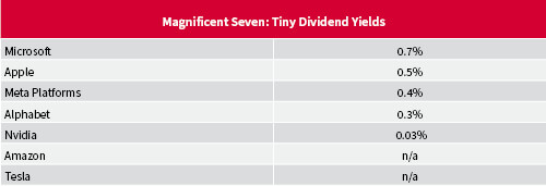 Big technology companies might have become more generous with dividends, but most dividends from these types of companies are token payments and sit second place to share buybacks. You are certainly not going to see any of the Magnificent Seven group of companies show up on a filter of high-yielding stocks. The most generous dividends come from Microsoft and its prospective yield is a meagre 0.7%.