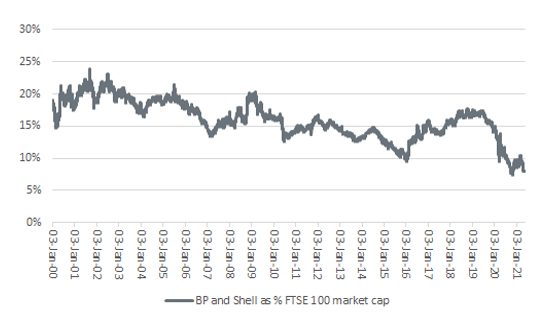 “BP’s and Shell’s market cap contribution to the FTSE 100 stands near its lows for this century, which may reflect ethical and environmental concerns as much as it does financial and operational ones.”