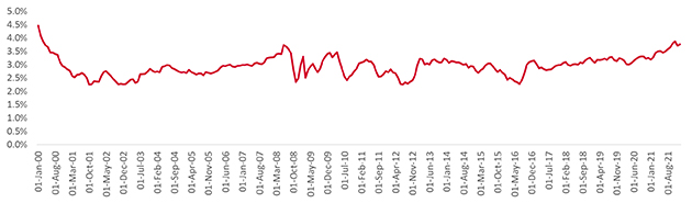 The UK bond market is unique, in the sense that there is high investor demand for inflation-linked bonds as they are used by pension funds to hedge against pension payments increasing due to higher inflation. These buyers are insensitive to short-term changes in capital value, and instead are only focused on the changes between the value of its assets (inflation-linked bonds) and liabilities (future pension payments). This means that when buying inflation-linked bonds ‘passively’ in the UK, the average maturity of bonds in the FTSE Actuaries UK Index-Linked Gilts All Stocks Index, a measure of all inflation-linked gilts issued by the UK government in sterling, is 21 years. This means the change in capital described previously is greater in magnitude, as this is linked to the length of time left until it matures. A 1% increase in real yields would lead to fall of around 20% for the index, dwarfing the inflationary increase in coupon payments.