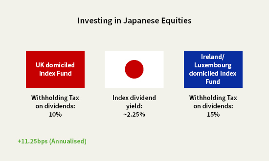 A fund’s domicile, i.e. the country where it's officially registered, will impact the financial rules that the fund has to follow and can significantly impact the operations of the fund. This can have a larger-than-expected impact on returns, often due to how the fund is taxed and the presence of tax treaties between nations. For a passive fund investor, focusing only on TER and not considering domicile can often mean missing out on improved returns from preferring one domicile over another, which in some cases can mean performance impacts larger than the TER saving. A stylised example for a Japanese equity index fund is given below, where a UK-domiciled fund would achieve a 11.25bps annualised performance improvement, simply due to a more favourable withholding tax treaty, versus an index fund domiciled in Ireland or Luxembourg, all else being equal.