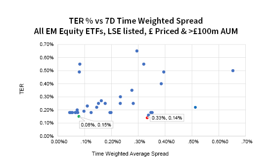 Spreads refers to the difference between the bid and ask prices of an ETF, representing the cost an investor incurs when buying or selling shares of the fund. A narrow spread implies a more liquid ETF, resulting in lower transaction costs. Conversely, a wider spread means higher trading expenses, potentially eroding returns. It is essential to factor in spreads, as they can have a significant impact on your investment, especially if you frequently trade or invest substantial sums. In some cases, two similar products may have similar TERs, but one may trade much tighter in the market, whilst the other would cost multiples of the TER to buy into and sell out of. The example below compares the weekly average spread of all UK LSE-listed global emerging market ETFs that are over £100 million AUM, to their TERs. As you can see, one of the lowest TER products is available at 0.15% and also has one of the lowest spreads at 0.08%. However, another product from a well-known issuer, whilst carrying a TER that is 1bps cheaper at 0.14%, had an average spread that week that was over three times larger. If this large spread differential was persistent, it would completely erase any benefit from the cheaper TER, all else being equal. So, whilst it's important to highlight that this is a very short time frame to assess spreads over and is only used as an example, it shows it is important to be aware that spreads can be multiples of TER in some products, so selecting on low TER alone is unwise.