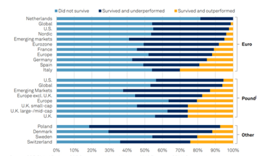 Data from S&P shows how few active funds have outperformed their index over the last decade and, perhaps more surprisingly, how few funds actually survive. For example, for UK equity funds, around a quarter outperformed their index and less than half survived the full 10-year analysis period.
