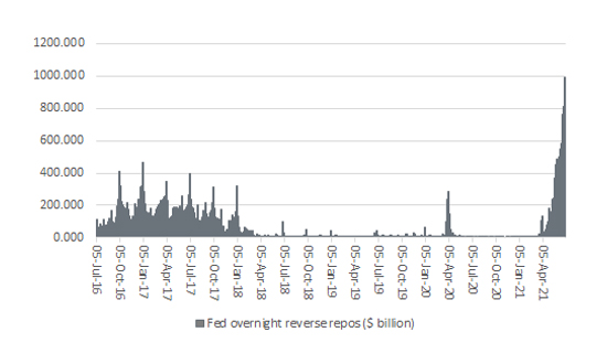 “The US Federal Reserve is using reverse repos in vast quantities to drain liquidity from markets and the US financial system even as it continues to run QE at $120 billion a month.”