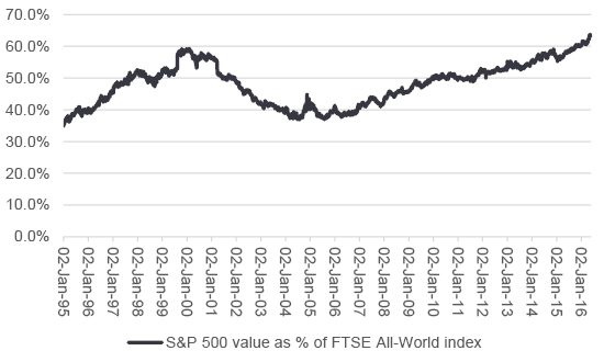 e in turn means the S&P 500 represents 63% of the FTSE All-World’s market valuation, a level that exceeds even the high seen at the peak of the technology, media and telecoms bubble in 2000.