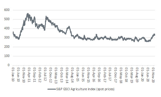 A month ago (Shares, 26 November 2020), this column flagged how commodity prices were rising and how this could be a possible harbinger of inflation, whether it was down to near-term factor such as a La Niña weather pattern or something more deep-rooted. The answer will only become clear with the fullness of time but one trend is worthy of further attention, namely the trend in the S&P GSCI Agriculture index – because if ever a price chart suggests an asset class is breaking a multi-year downtrend, then this could be it.