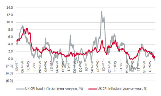 A deal could still ease any such worries but the break in the downward trend in global food prices is eye-catching all the same. The good news is that, in the latest UK inflation figures (15 December), food prices fell by 0.6% on average year over year, helping to anchor the headline consumer price index (CPI) inflation rate at 0.3%. But if food prices do suddenly take off, history suggests that the headline rate could catch light, too, a development which neither central banks nor financial markets seem to be expecting.