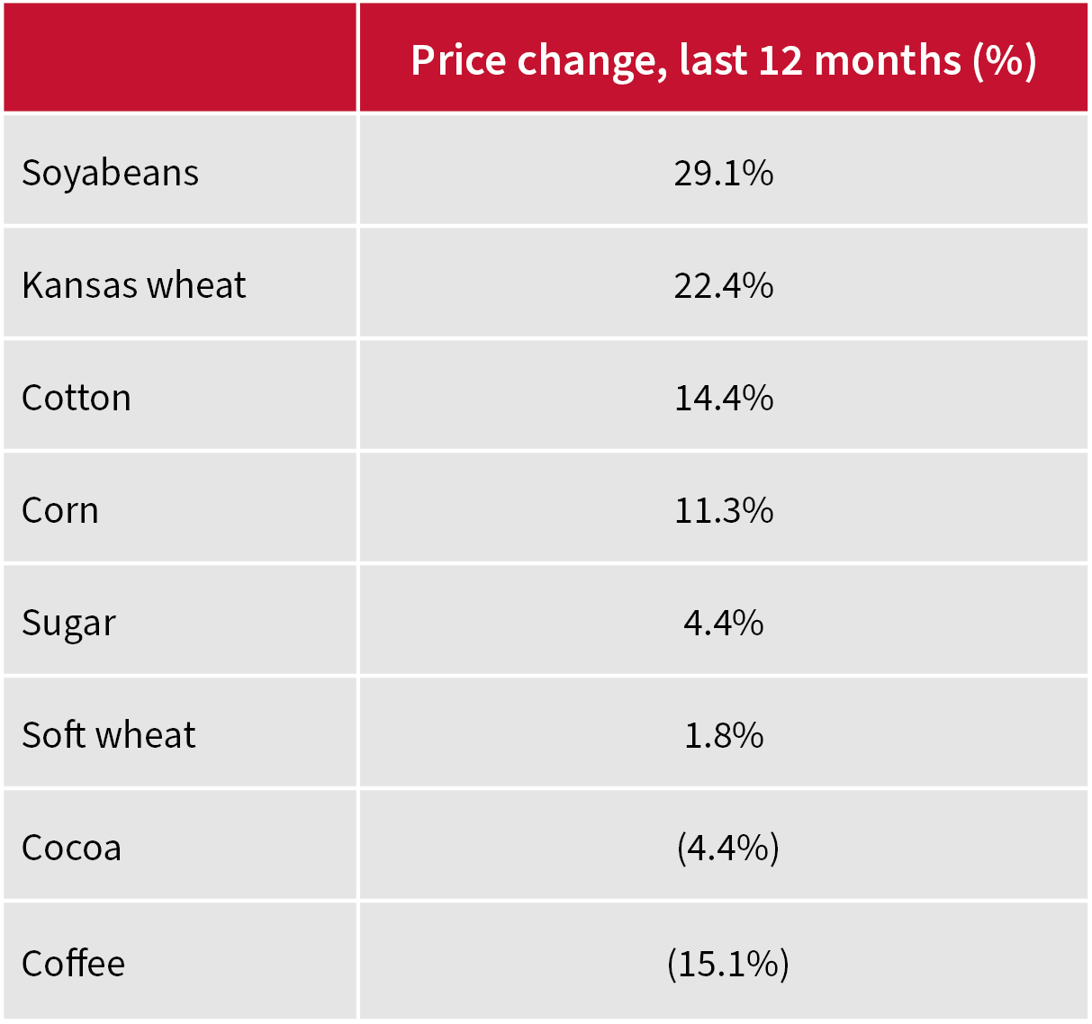 Soybeans, wheat and corn prices have gone up the most over the last 12 months