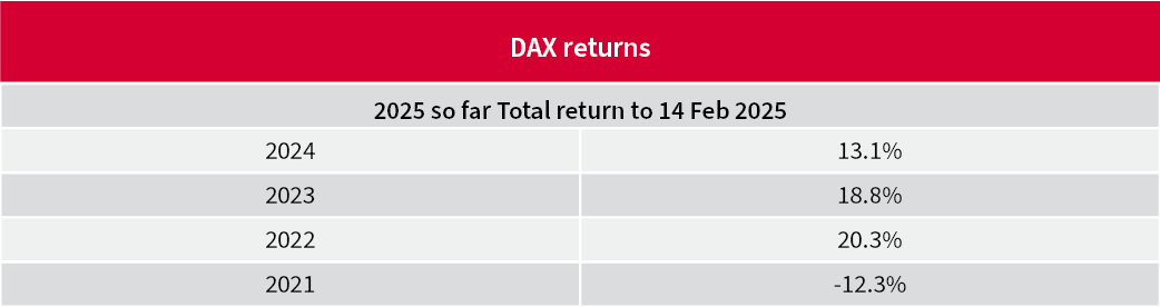 Germany generated a 13.1% total return between 1 January and 14 February 2025, more than three times that of the S&P 500 (4.1%) and the Nasdaq (3.7%) in the US. Admittedly, that’s a brief period in which to assess performance, but it’s unusual for Germany to outperform in such a way.
