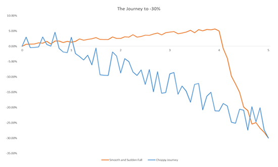 The annualised standard deviation of the smooth path with the sudden drop is 6%. The choppy journey has a much higher standard deviation at 17%. However the ‘risk’ for both assets is the same.