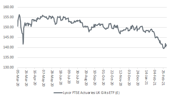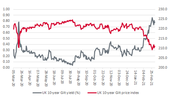 The benchmark 10-year Gilt yield in the UK has surged of late. It is not easy to divine whether this is due to the fixed-income market worrying about inflation or a gathering acknowledgement that the UK’s aggregate £2 trillion debt is only going one way – up. But the effect on Gilt prices is clear, since bond prices go down as yields go up (as is also the case with equities).