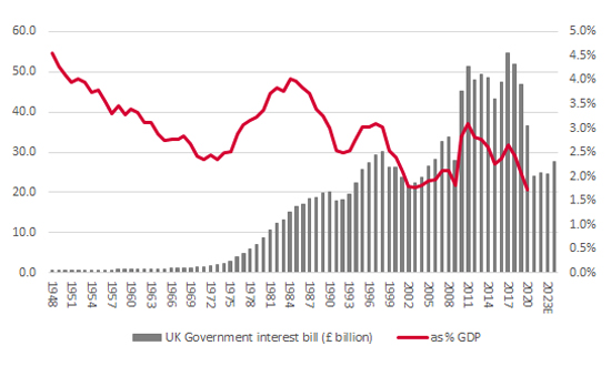“The UK’s financial situation may not be quite as bad as it seems because the Bank of England’s monetary policy means the Government’s interest bill as a percentage of GDP has hardly ever been lower, at least in modern times.”