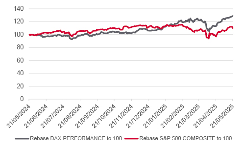 Dax versus S&P 500 rebased to 100 - 1 year overview