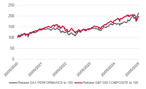 Dax versus S&P 500 rebased to 100 - 5 year overview