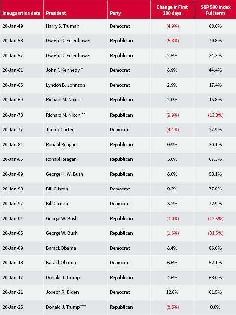 Source: LSEG Refinitiv data. * John F. Kennedy assassinated in November 1963 and replaced by Lyndon B. Johnson. ** Richard M. Nixon resigned August 1974 and replaced by Gerald R. Ford. ***Donald J. Trump up to 24 April 2025