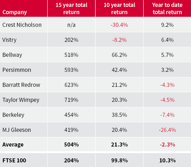So far this year, the sector has lost 2.3% on average based on share price movements and dividends versus a 10.3% positive total return from the FTSE 100. At the top end, Crest Nicholson has nearly matched the FTSE 100’s return whereas MJ Gleeson has lost 26.4%.