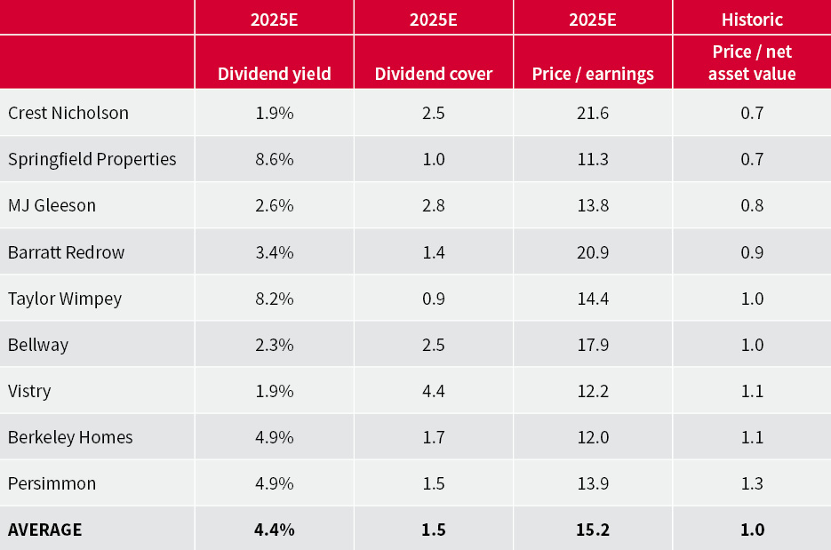 Valuations are not expensive across parts of the housebuilding sector relative to history. In boom times, it’s normal to see housebuilders trade on two times net asset value. Today, they trade at or below one-times.