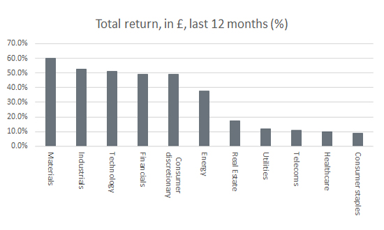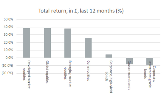 Incredible as this would have seemed a year ago, ‘risk’ assets are showing the best total returns in sterling-denominated terms over the 12 months, as equities and commodities easily outpace bonds. Within fixed income, the riskiest option – high-yield corporate paper – continues to lead Government and investment-grade corporate debt.