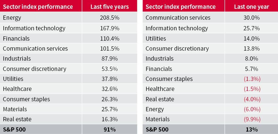 Take a five-year view, and go back to ‘Pfizer Monday,’ and the S&P 500 looks reasonably balanced with energy and financial stocks among the vanguard, alongside information technology and communication services and industrials. This mix flags not only American dominance in tech and AI, but also the strong nature of the economic rebound post-COVID, not to mention the value that can be accrued by buying sectors when their fortunes are at their lowest ebb and valuations are washed out (as was the case with energy and financials back in 2020).