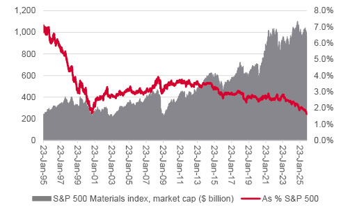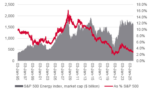 The net result of these trends is that the ‘Magnificent Seven’ of Alphabet, Amazon.com, Apple, Meta Platforms, Microsoft, NVIDIA and Tesla now represent nearly 40% of the S&P 500’s stock market capitalisation between them. At the other end of the scale, the energy sector is now worth just 2.8% of the headline index and materials just 1.6%, even if the importance of energy and resource independence seems clearer than ever in light of the war in Ukraine, fragile peace in the Middle East and ongoing tensions over the supply of critical minerals with China, to name but one.