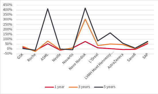 The GRANOLAS consists of eleven names: GSK, Roche, ASML, Nestle, Novartis, Novo Nordisk, L’Oreal, Louis Vuitton, AstraZeneca, SAP and Sanofi. Of these, Novo Nordisk and ASML have enjoyed good share price gains of late and GSK and SAP are finally winning over the market. L’Oreal, LVMH and Novartis are slow burners but are moving in right direction. However, shares in Sanofi are not doing much and Roche and Nestle at are multi-year lows so the full pack is not delivering the gains in a way we saw with the Magnificent Seven last year.