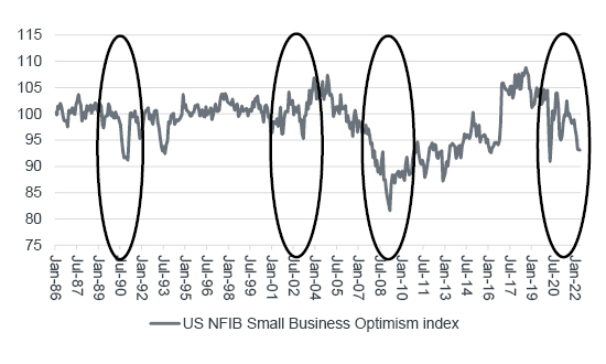 “The NFIB has gone below 95 three times since 1985 and each time signalled a recession (the indicator got down to 96 in the 2001-02 downturn).”