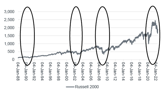 Smaller companies tend to be much more sensitive to their local economy than mega-cap multi-nationals. The Russell peaked before the 1991-92, 2001-02 and 2007-09 recessions.