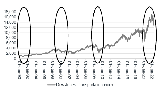 And Richard Russell’s Dow Theory states that the Industrials cannot do well if the Transports are doing badly, because weak transport stocks implies that goods are not being shipped because of an inventory pile-up, weak end demand or both. By contrast, a surge in transport stocks suggests end-demand is good, because shelves and forecourts must be replenished and the newly-manufactured products must be moved around.