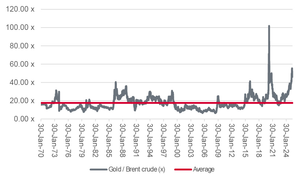 • Since 1970, one ounce of gold has on average bought 17 to 18 barrels of oil. It currently buys 46 barrels.