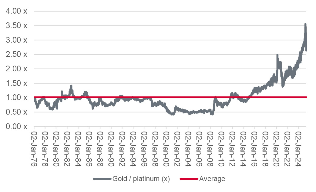 • Since 1976, an ounce of gold has on average bought an ounce of platinum. It currently buys 2.7 ounces.