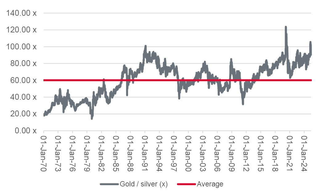 • Since 1970, one ounce of gold has on average bought 60 ounces of silver. It currently buys 94 ounces.
