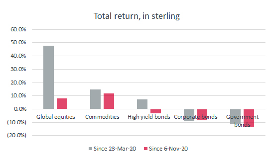 Lo and behold, 12 months later and the picture is very different. Any advisers or clients shrewd enough to have stored up some cash and brave enough to have started to take on more risk a year ago would have done remarkably well, as four datasets show. Advisers and clients now must decide whether these trends will continue, further changes in performance trends since ‘Pfizer Monday’ on 9 November will dictate, or whether a further shift in gear is imminent.