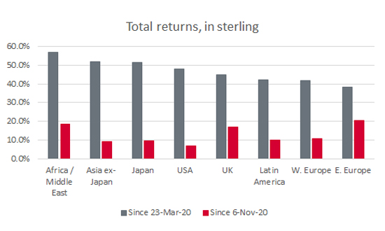 America’s domination of early 2020 has faded and it is prior laggards who have come to the fore – emerging markets and even the unloved UK equity market have put on a spurt, finding itself outpaced by just Eastern Europe and the Africa/Middle East region since November. This may be down to the perception that the UK is ahead of the game when it comes to vaccination programmes, having previously struggled to contain the virus.