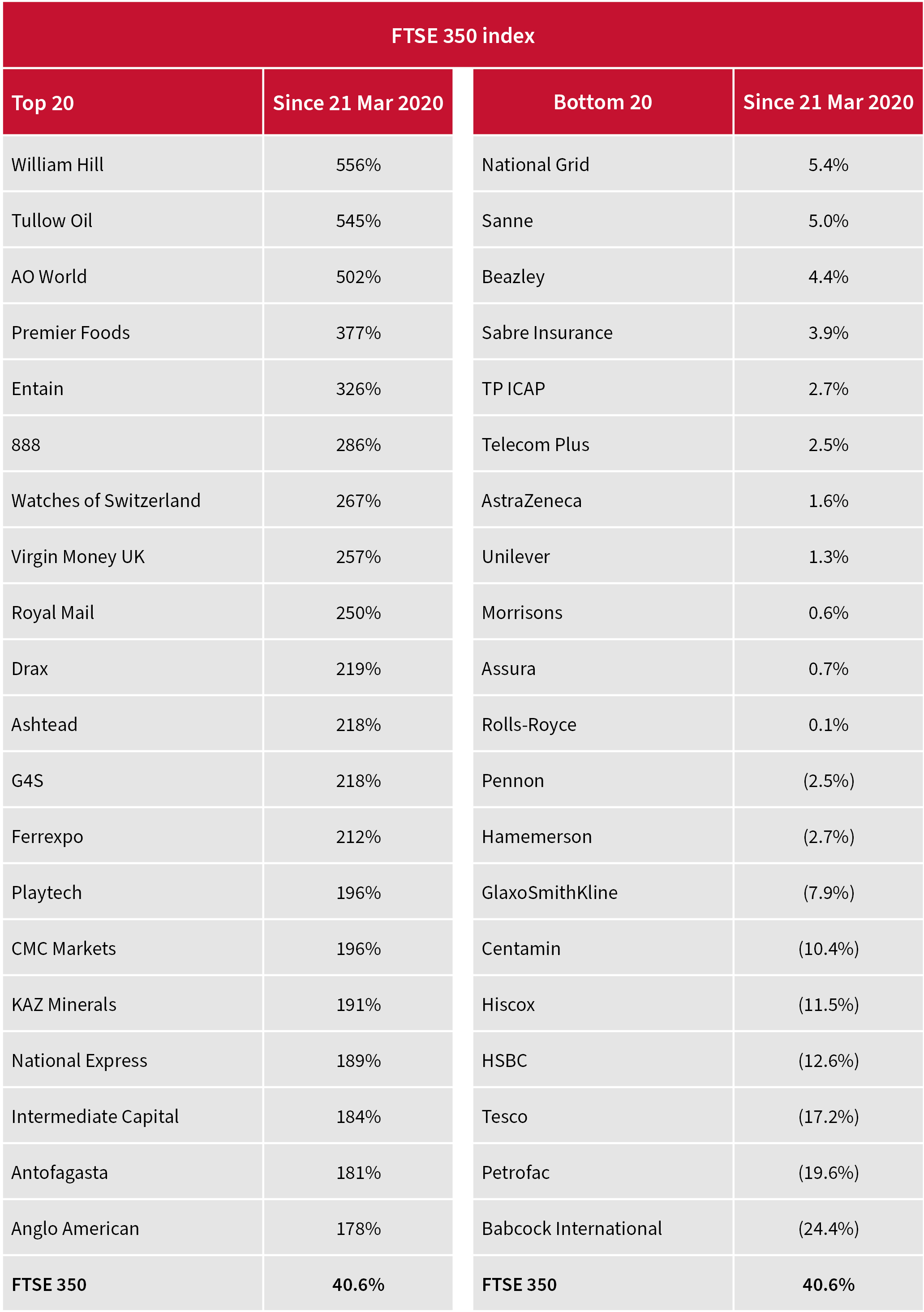 Without wishing to belabour the details, the list of the FTE 350’s best 20 performers over the last year includes pandemic winners like AO World, gaming and gambling plays 888 and Playtech, as well as comfort food provider Premier Foods. But they are outnumbered by miners and other economically-sensitive names like Virgin Money UK, while the prevalence of bid candidates like William Hill, G4S and KAZ Minerals hints at the value that the downtrodden UK market offered a year ago.