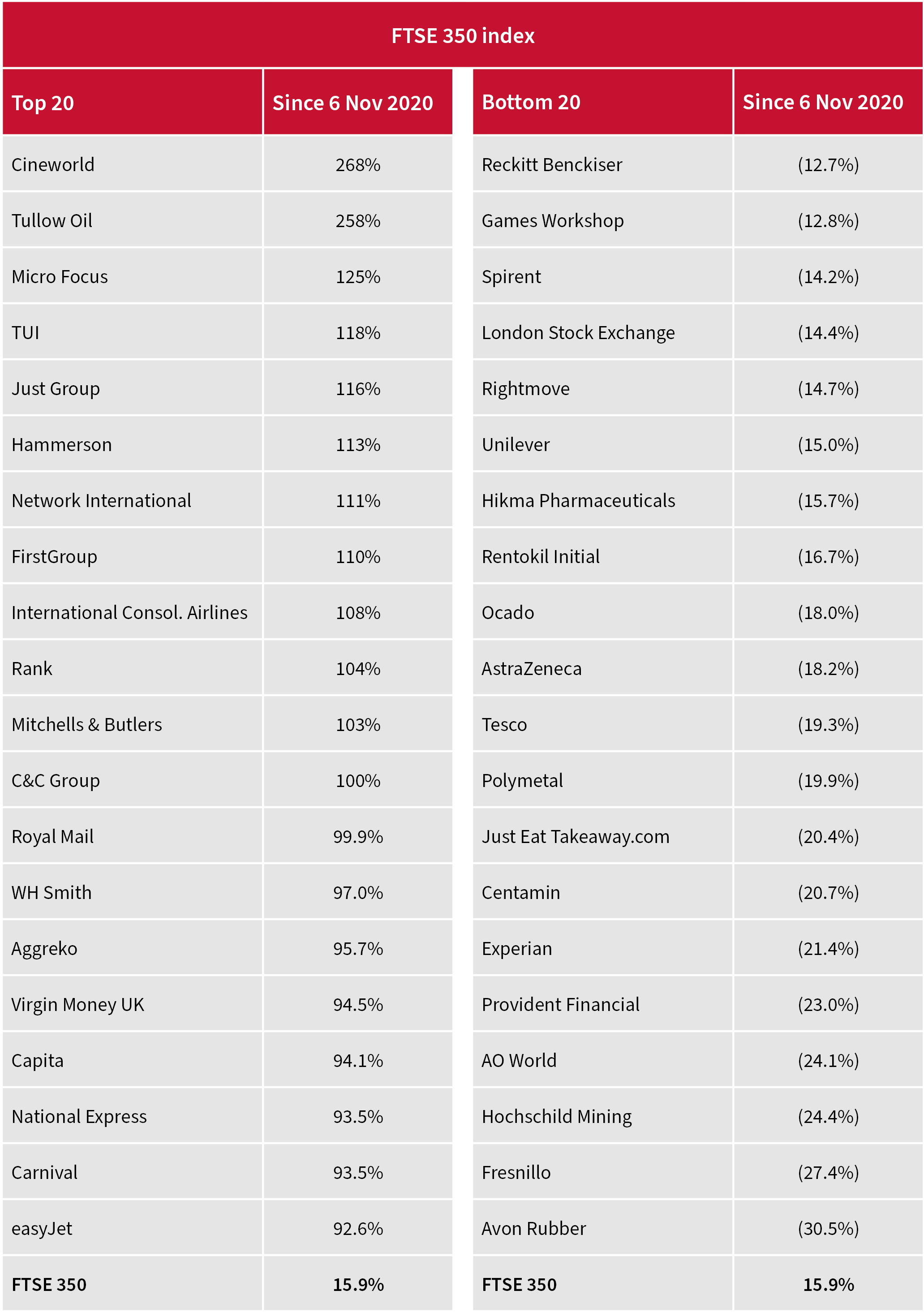 These trends have become even stronger since Pfizer Monday. Beneficiaries of an economic reopening dominate the leaderboard, notably travel and leisure stocks. The laggards include online delivery plays Ocado and Just Eat Takeaway.com (a red flag for the Deliveroo float?); precious metal miners; pharmaceutical plays; and such dependable names as Reckitt Benckiser, Games Workshop and Avon Rubber – where market participants may have paid too high a valuation, and thus mistaken reliability of earnings for safety of share price. Pay the wrong valuation and nothing is safe.
