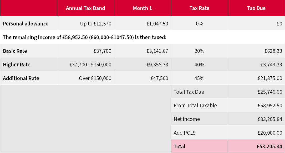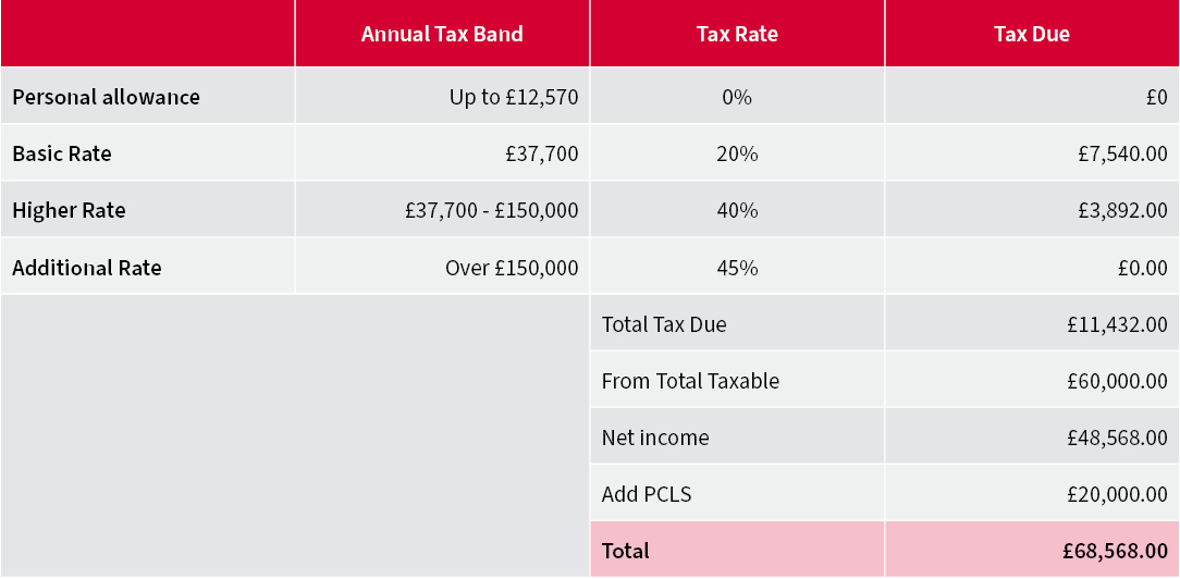 In the below example a fund of £80,000 has been crystallised. £20,000 has been paid as a PCLS and the member is making a one-off income withdrawal of £60,000. The amount they receive under the emergency tax code is £53,205, with the tax calculation below: