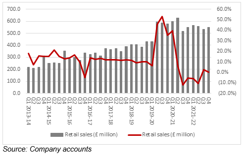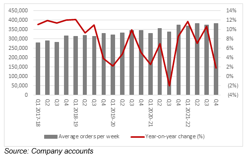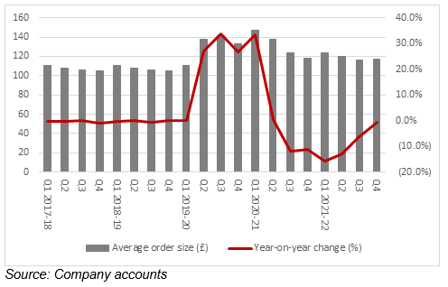 It also acknowledges an 8% drop in volumes and cites the two factors combined as the reason behind a near-1% drop in average order size to £117 a basket. The growing prevalence of M&S goods and products on the platform may not be helping here.