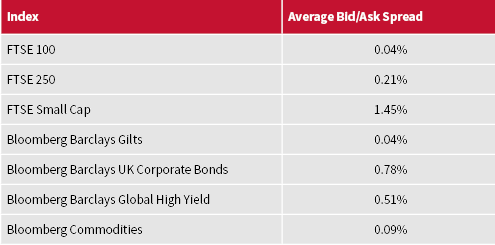 With the above in mind, it is always important to consider the market being tracked by a passive investment. A quick rule of thumb is to investigate the average bid/ask spreads of the securities in the index. When this is larger than average, it is an indication that the market is less liquid and the investments, therefore, carry a larger liquidity premium. The average bid ask spreads for some common indices are as follows: