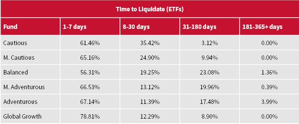 As can be seen, based on the liquidity of the underlying liquidity of the securities within the ETFs, with the exception of 0.02% in the Global Growth Fund, all holdings could be liquidated within a week based on trading up to 25% of the daily volume of the securities – a percentage that is estimated to have minimal impact on the prices of securities.