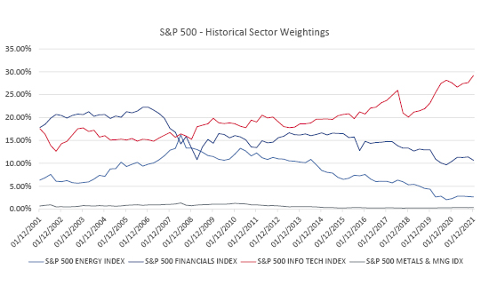 This was not the case ten years ago, where the top ten stocks represented only about 18% of the index (versus 29% as at 31 December 2021) and only included three technology stocks, alongside two oil companies, an industrial company, a consumer product company, a pharmaceutical company, a telecommunications company, and a bank. This indicates that the index then wasn’t as exposed to the fortunes of a very small number of growth stocks in one sector but more broadly to several sectors. Similarly, the sector weighting for some direct inflation beneficiaries has been higher in the past than it is now and also, the general level of industrial commodities has been marginal for a long time: